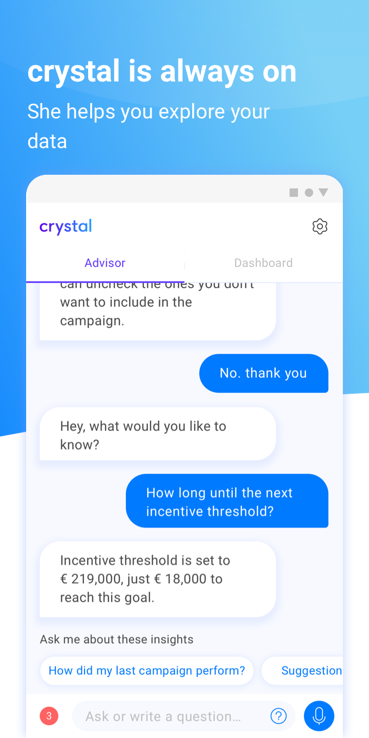 Make every decision data-driven with crystal, the virtual colleague that advises you through your business data.